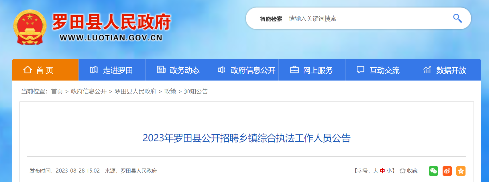 《公告》(含《崗位表》)擬于2023年8月28日通過羅田縣人民政府網(wǎng)(http://www.luotian.gov.cn/)和羅田縣人社局微信公眾號面向社會公開發(fā)布。