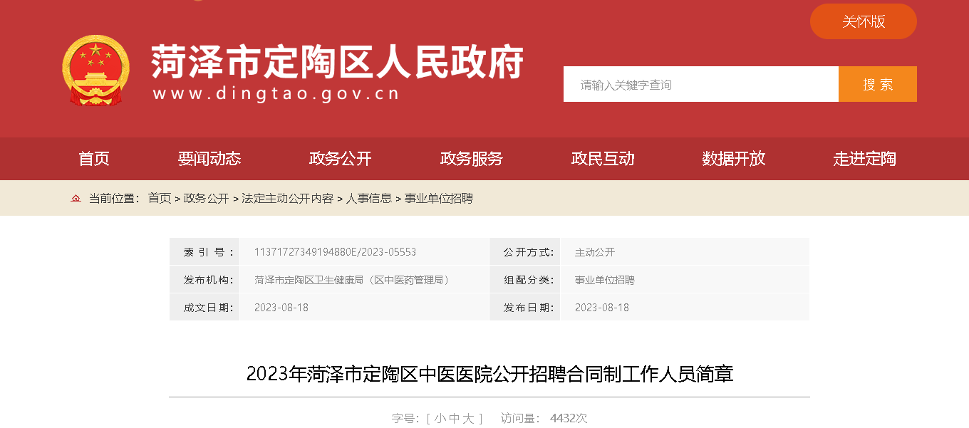 2023年山東菏澤市定陶區(qū)中醫(yī)醫(yī)院公開招聘合同制工作人員4人,報名時間:2023年8月30日9:00—9月1日16:00,現(xiàn)將招聘公告原文發(fā)布如下: