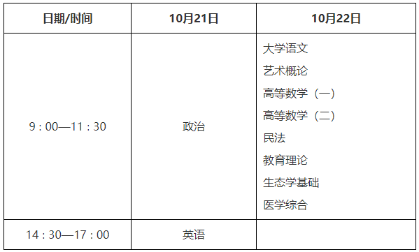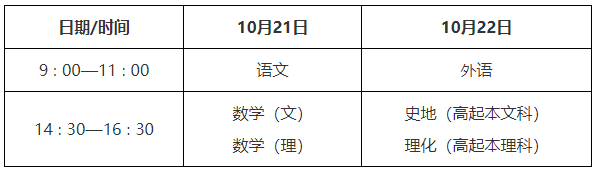 2023年陜西安康成人高校招生統(tǒng)一考試定于10月21日、22日進行。考試時間如下: