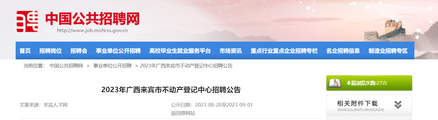 2023年廣西來賓市不動產(chǎn)登記中心招聘工作人員。報名時間:2023年8月28日—2023年9月1日?,F(xiàn)將公告原文發(fā)布如下: