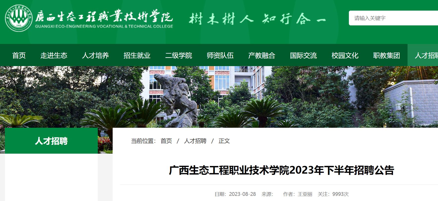 2023年下半年廣西生態(tài)工程職業(yè)技術(shù)學(xué)院招聘公告已發(fā)布,報名時間:發(fā)布之日起接受報名?,F(xiàn)將招聘公告原文發(fā)布如下: