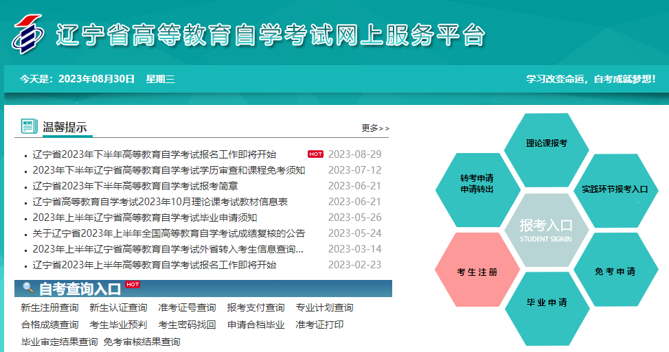 自學考試頻道根據(jù)遼寧招生考試之窗公布的《遼寧2023年下半年高等教育自學考試報名的通知》了解到,遼寧葫蘆島2023年下半年自考報名時間已公布,將于9月1日9時開始。具體如下: