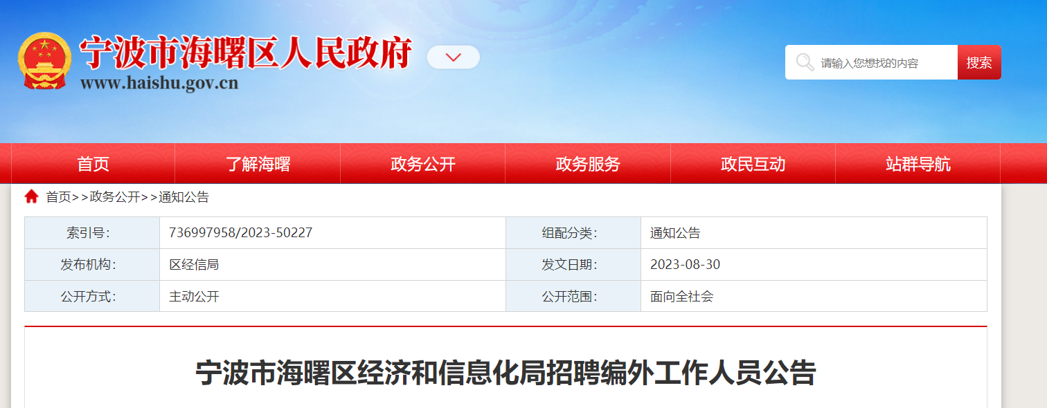 2023年浙江省寧波市海曙區(qū)經(jīng)濟(jì)和信息化局招聘編外工作人員2人。報名時間:公告之日起至2023年9月15日止?,F(xiàn)將公告原文發(fā)布如下: