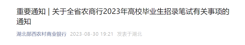 2023年湖北鄖西農(nóng)村商業(yè)銀行高校畢業(yè)生招錄筆試有關(guān)事項的通知已發(fā)布,筆試時間:2023年9月2日上午9:00至10:30,準(zhǔn)考證下載打印時間:2023年8月31日上午9:00至9月2日9:00,現(xiàn)將公告發(fā)布如下: