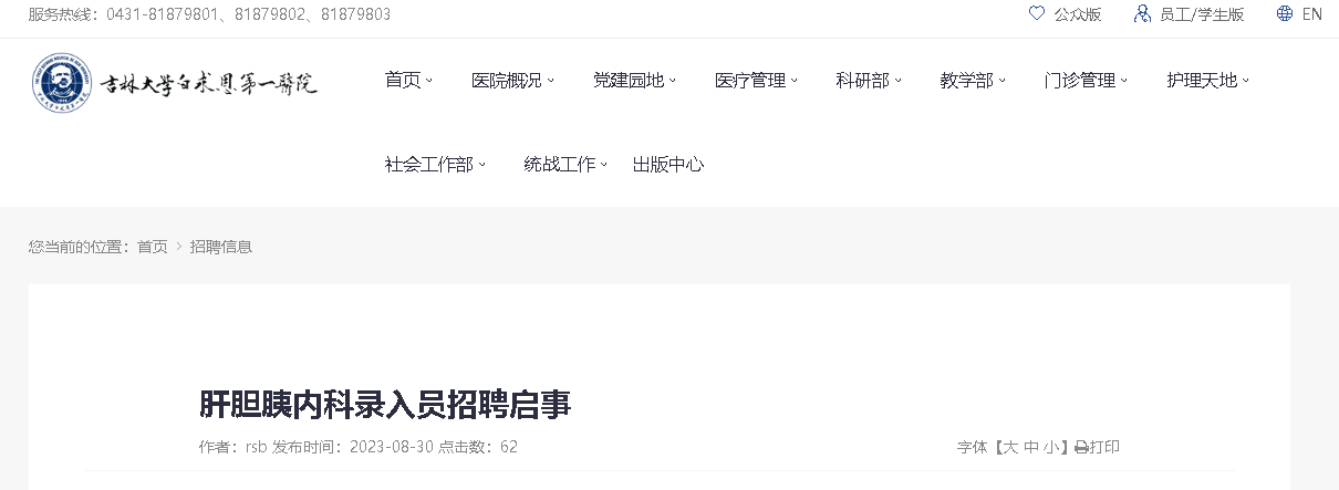 吉林大學(xué)第一醫(yī)院www.jdyy.cn是我院發(fā)布招聘啟事的官方網(wǎng)站,所有招聘信息均以官方網(wǎng)站發(fā)布為準(zhǔn)。