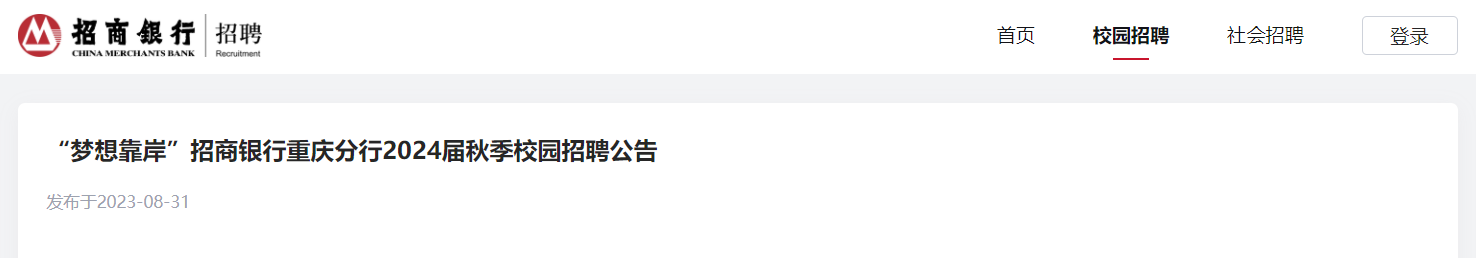 2024屆夢想靠岸招商銀行重慶分行秋季校園招聘公告已發(fā)布,簡歷投遞時間:2023年10月9日截止,現(xiàn)將招聘公告發(fā)布如下: