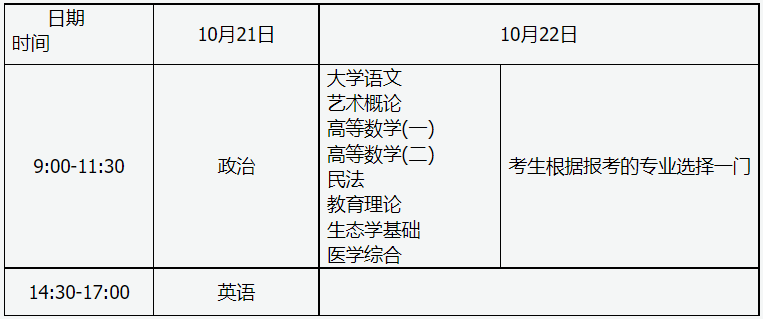 2023年山西陽泉成人高考考試時(shí)間為10月21日至22日,具體時(shí)間及科目安排如下表: