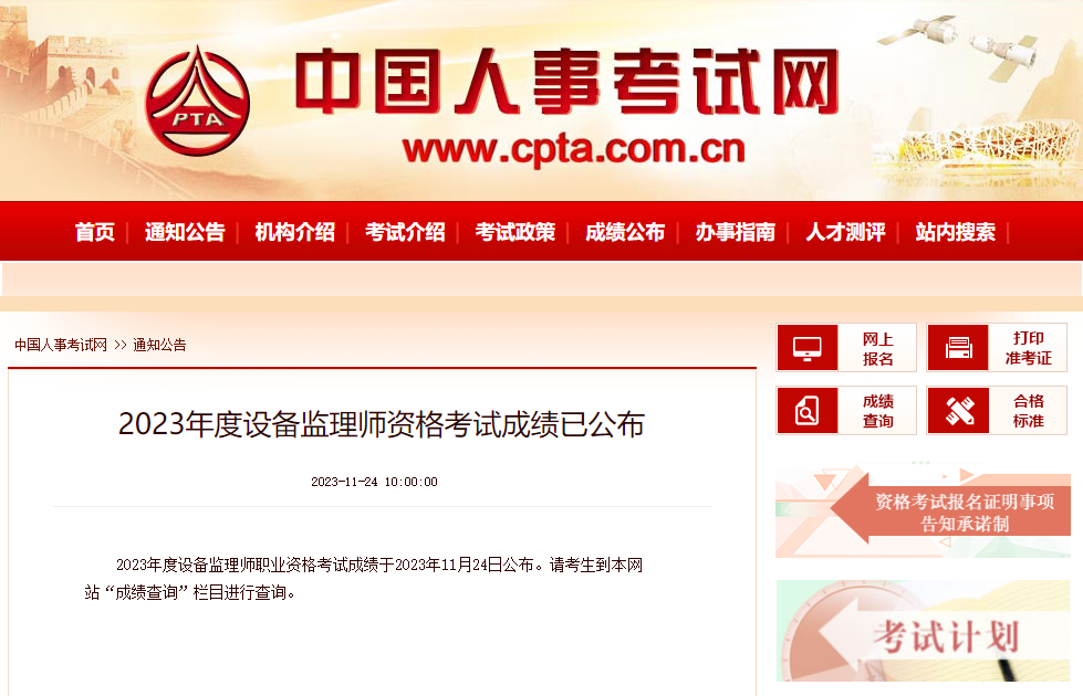 2023年江西設(shè)備監(jiān)理師職業(yè)資格考試成績(jī)于2023年11月24日公布。請(qǐng)考生到中國(guó)人事考試網(wǎng)站“成績(jī)查詢”欄目進(jìn)行查詢。