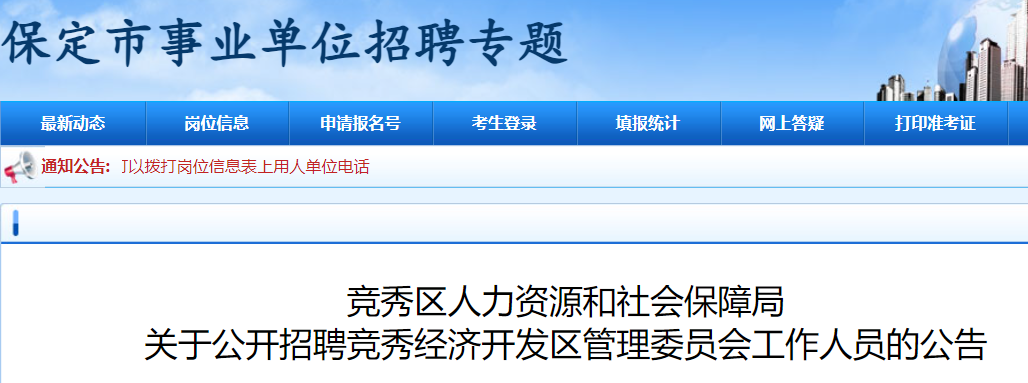 為進(jìn)一步保障河北保定競(jìng)秀經(jīng)濟(jì)開發(fā)區(qū)管理委員會(huì)快速發(fā)展需要,充實(shí)工作力量,更好地為我區(qū)經(jīng)濟(jì)社會(huì)高質(zhì)量發(fā)展提供強(qiáng)有力的人才支持,結(jié)合競(jìng)秀經(jīng)濟(jì)開發(fā)區(qū)發(fā)展實(shí)際,決定面向社會(huì)公開招聘15名事業(yè)編制工作人員。為保證公開招聘的順利實(shí)施及結(jié)果的公正、公平,根據(jù)《河北省事業(yè)單位公開招聘工作人員暫行辦法》、《保定市事業(yè)單位公開招聘工作人員暫行辦法》和《〈關(guān)于促進(jìn)高校畢業(yè)生來保定就業(yè)創(chuàng)業(yè)的十二條措施〉的通知》等文件規(guī)定,現(xiàn)公告如下: