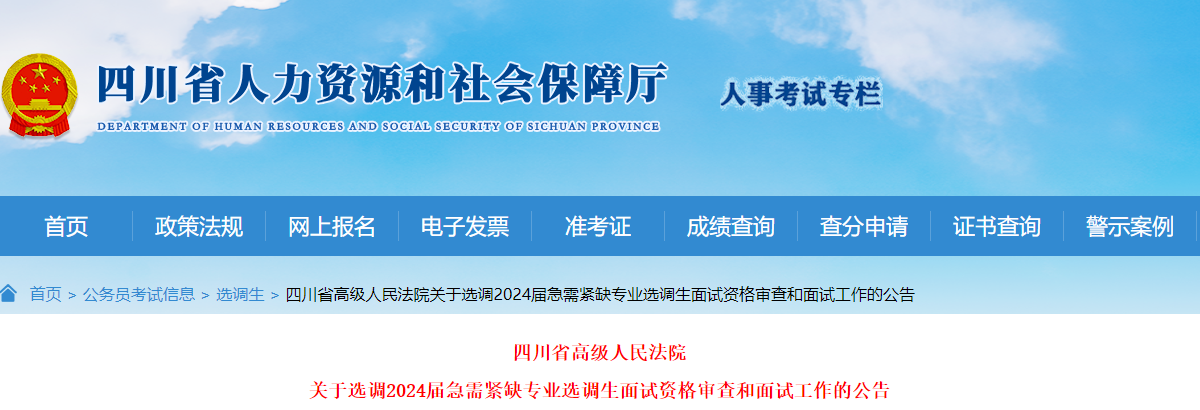 從四川省人力資源和社會保障廳了解到,2024屆四川省高級人民法院急需緊缺專業(yè)選調(diào)生面試資格審查和面試時(shí)間已公布,相關(guān)事宜詳情如下: