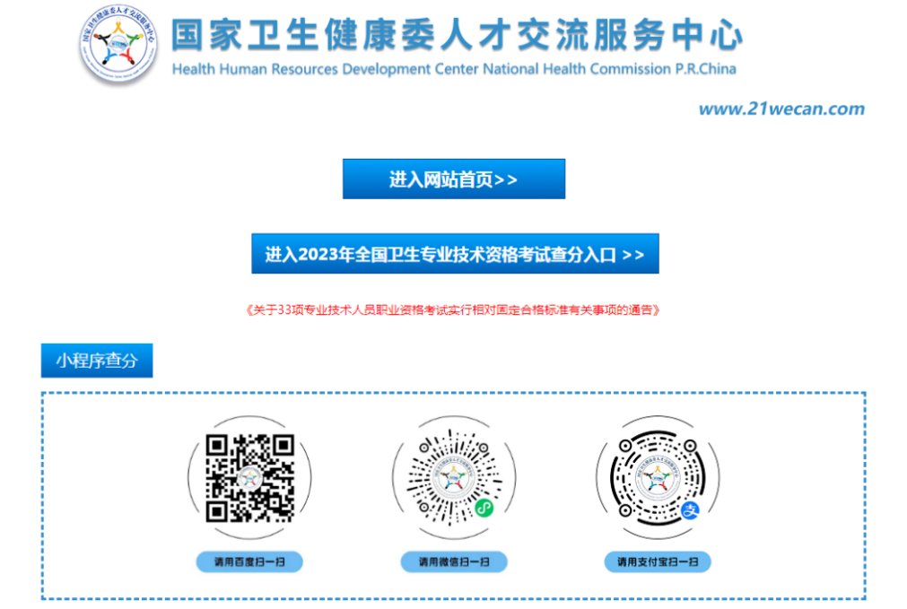 1、國(guó)家衛(wèi)生健康委人才交流服務(wù)中心官方網(wǎng)站和小程序是查詢2023年度衛(wèi)生專業(yè)技術(shù)資格考試成績(jī)的正式途徑。