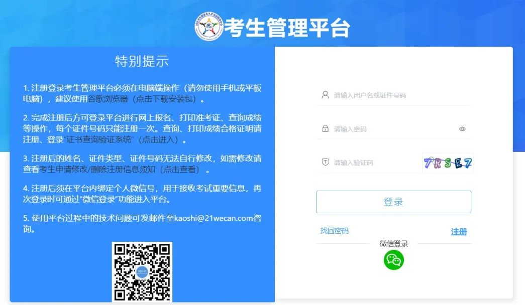 2、考生使用報(bào)名階段時(shí)注冊(cè)的用戶名、密碼,登錄考生管理平臺(tái);也可通過“微信登錄”功能,使用綁定的微信號(hào)掃碼登錄考生管理平臺(tái)。
