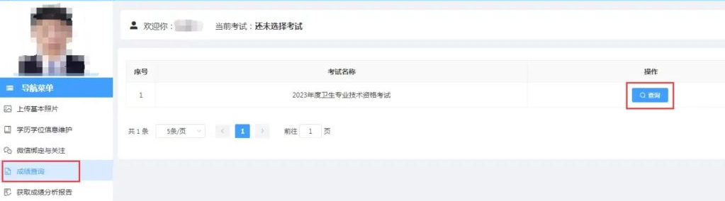 3、先點(diǎn)擊左側(cè)導(dǎo)航菜單中的“成績(jī)查詢”功能,再點(diǎn)擊2023年度衛(wèi)生專業(yè)技術(shù)資格考試項(xiàng)目右側(cè)的“查詢”按鈕即可顯示查詢結(jié)果。