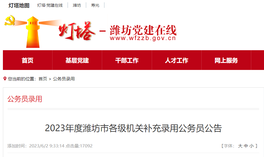 從燈塔-濰坊黨建在線獲悉,根據(jù)2023年山東濰坊市各級(jí)機(jī)關(guān)招錄公務(wù)員公告,現(xiàn)面向社會(huì)統(tǒng)一進(jìn)行補(bǔ)充錄用,更多事宜請(qǐng)參考閱讀《考試公告》,官方公告原文如下: