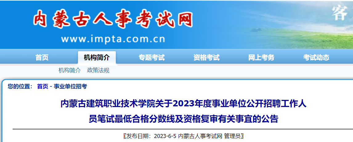 內(nèi)蒙古建筑職業(yè)技術(shù)學(xué)院2023年度公開招聘分類考試筆試總成績已發(fā)布,請考生自行登錄報名網(wǎng)站查詢成績。根據(jù)內(nèi)蒙古自治區(qū)人力資源和社會保障廳文件《關(guān)于印發(fā)<內(nèi)蒙古自治區(qū)事業(yè)單位公開招聘人員辦法>的通知》(內(nèi)人社發(fā)〔2022〕2號)工作要求與《內(nèi)蒙古建筑職業(yè)技術(shù)學(xué)院2023年度事業(yè)單位公開招聘工作人員公告》要求,現(xiàn)將我單位筆試總成績最低合格分數(shù)線及資格復(fù)審相關(guān)事宜予以公布,具體如下: