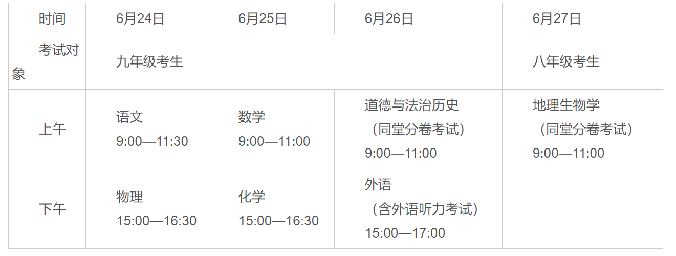 中考考試的主要對(duì)象是具有我市學(xué)籍并在我市就讀的八年級(jí)、九年級(jí)應(yīng)屆生;具有我市戶籍但在市外就讀的九年級(jí)應(yīng)屆生;需要報(bào)考我市普通高中的具有我市戶籍的歷屆初中畢業(yè)生或同等學(xué)力者。