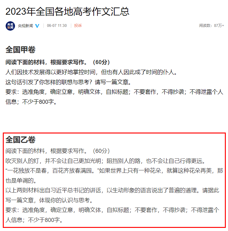 從央視新聞微博獲悉,2023年全國乙卷高考作文題目已公布,具體詳情如下: