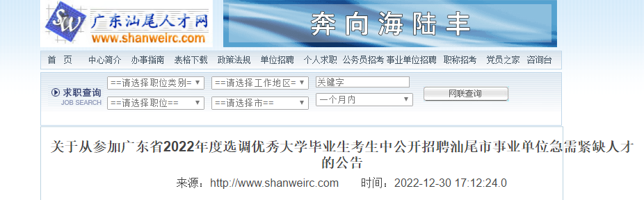 原文標(biāo)題:關(guān)于從參加廣東省2022年度選調(diào)優(yōu)秀大學(xué)畢業(yè)生考生中公開招聘汕尾市事業(yè)單位急需緊缺人才的公告