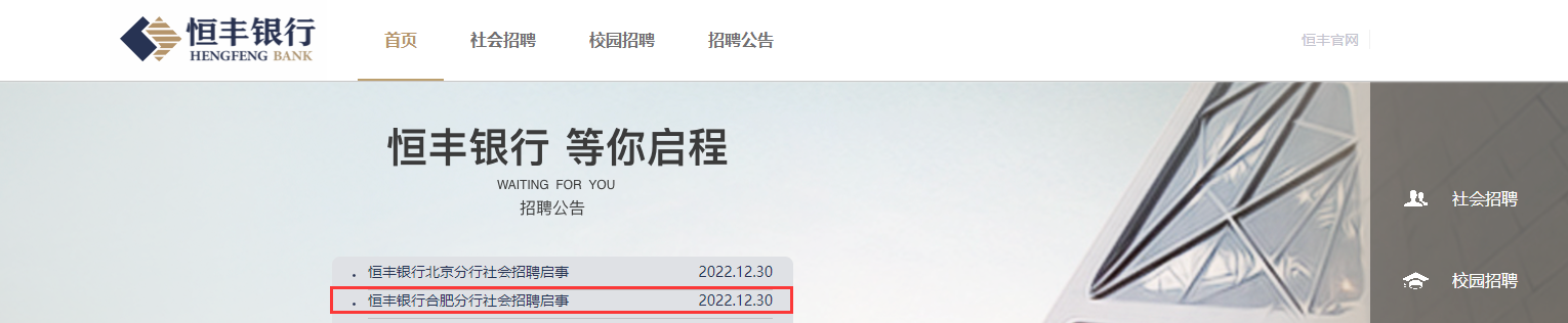 2023恒豐銀行安徽合肥分行社會招聘啟事已發(fā)布,報名時間:2023年12月31日截止,現(xiàn)將招聘公告發(fā)布如下: