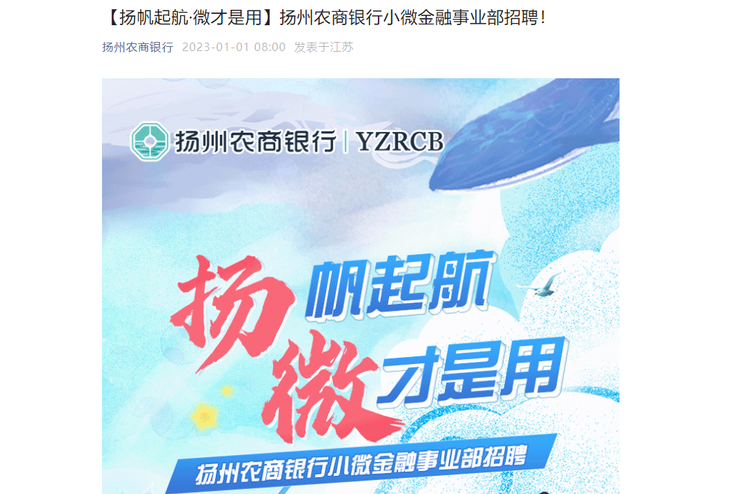 2023江蘇揚(yáng)州農(nóng)商銀行小微金融事業(yè)部招聘15人,現(xiàn)將招聘公告發(fā)布如下: