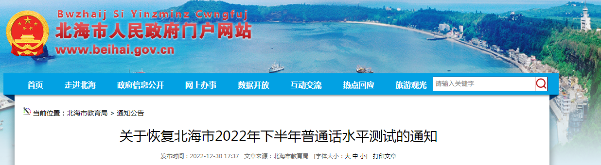 從北海市教育局獲悉,關(guān)于恢復(fù)廣西北海2022年下半年普通話水平測(cè)試通知已公布,考試時(shí)間2023年1月7日-1月8日,具體詳情如下: