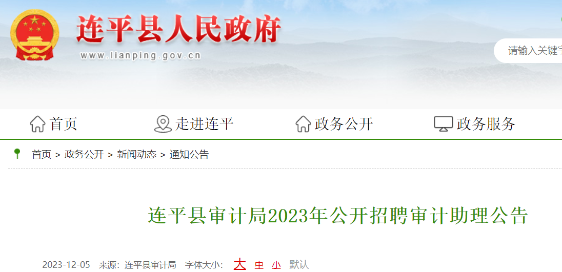 小編根據(jù)連平縣審計(jì)局發(fā)布“連平縣審計(jì)局2023年公開招聘審計(jì)助理公告”得知,2023廣東河源市連平縣審計(jì)局招聘審計(jì)助理2人,報(bào)名時(shí)間2023年12月8日至2023年12月14日。