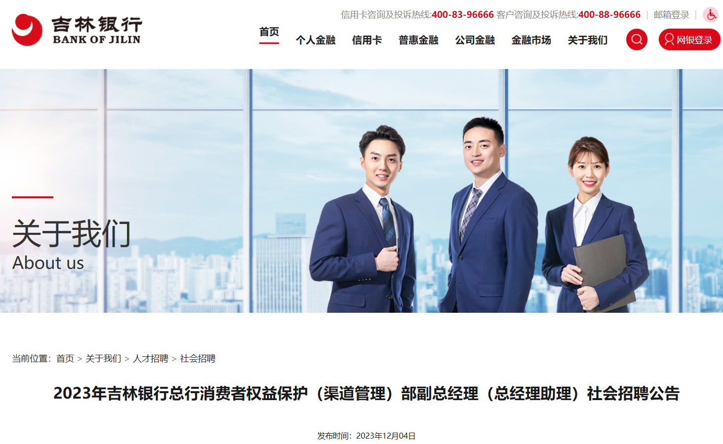 2023年吉林銀行總行消費(fèi)者權(quán)益保護(hù)(渠道管理)部副總經(jīng)理(總經(jīng)理助理)社會(huì)招聘公告已發(fā)布,報(bào)名截止日期:2023年12月15日16:30?,F(xiàn)將招聘公告原文發(fā)布如下: