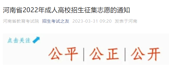 成人高考頻道從河南省教育考試院了解到,2022年河南成人高考招生征集志愿的通知已公布,具體如下: