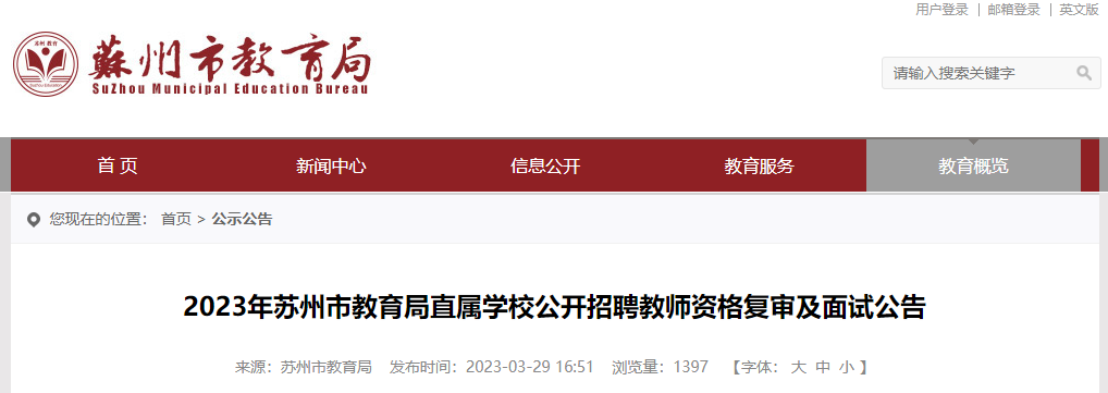 2023年江蘇蘇州市教育局直屬學(xué)校公開招聘教師資格復(fù)審及面試公告已發(fā)布,現(xiàn)將原文發(fā)布如下: