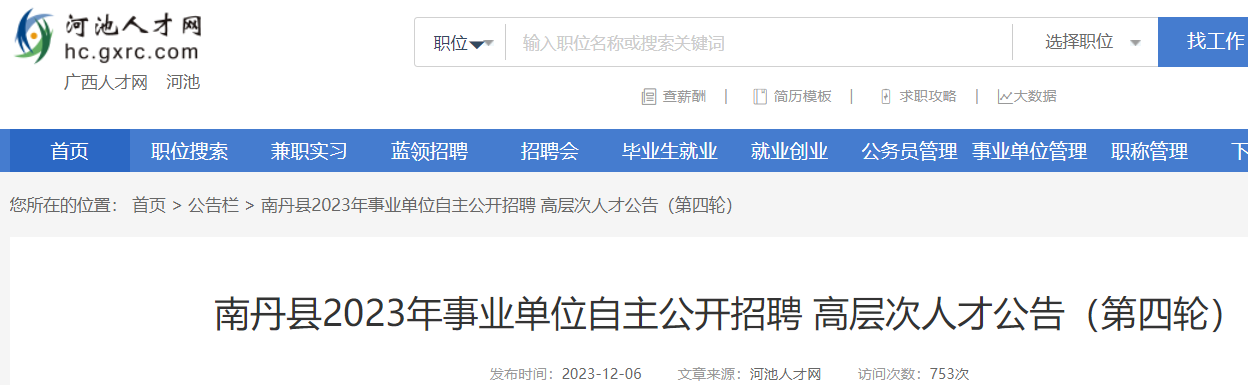 小編根據(jù)河池人才網發(fā)布”南丹縣2023年事業(yè)單位自主公開招聘 高層次人才公告(第四輪)“得知,2023廣西河池市南丹縣事業(yè)單位自主招聘高層次人才若干,招聘時間2023年12月10日。