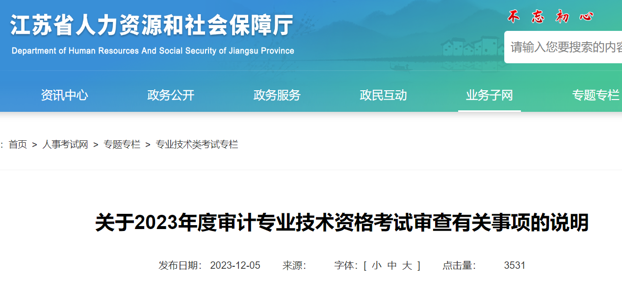 根據(jù)《江蘇省人力資源社會保障廳關于進一步加強專業(yè)技術人員資格考試審查工作的通知》(蘇人社發(fā)〔2018〕383號)、省人力資源社會保障廳省審計廳《關于2023年度審計專業(yè)技術資格考試考務工作有關事項的通知》(蘇人社函〔2023〕145號)文件規(guī)定和要求,我省將對2023年度審計專業(yè)技術資格考試全部科目成績合格人員進行考后資格審查,現(xiàn)將有關事項通知如下: