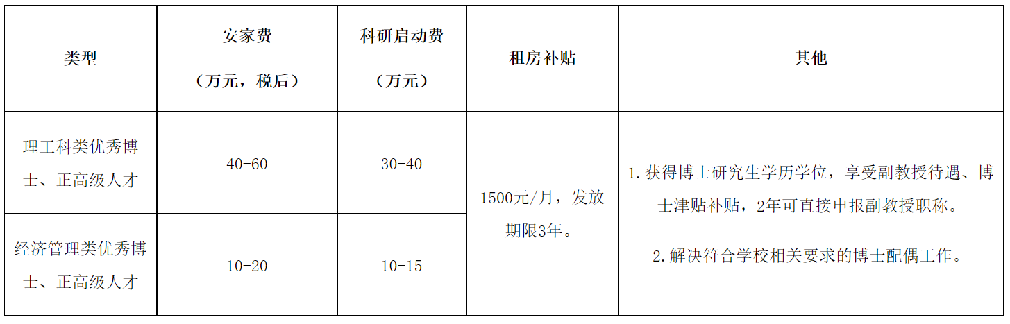 學(xué)校給予全職引進(jìn)高層次人才發(fā)放安家費(fèi)、科研啟動經(jīng)費(fèi)、租房補(bǔ)貼等。