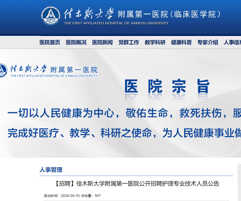 佳木斯大學(xué)附屬第一醫(yī)院是黑龍江省衛(wèi)健委直管的三級甲等綜合醫(yī)院,是省級區(qū)域醫(yī)療中心、地方高水平醫(yī)院、省東部地區(qū)醫(yī)學(xué)教育中心、臨床醫(yī)學(xué)科研中心、疑難病診斷及救治中心。為適應(yīng)發(fā)展需要,現(xiàn)面向社會公開招聘護(hù)理專業(yè)技術(shù)人員,招聘方案公告如下: