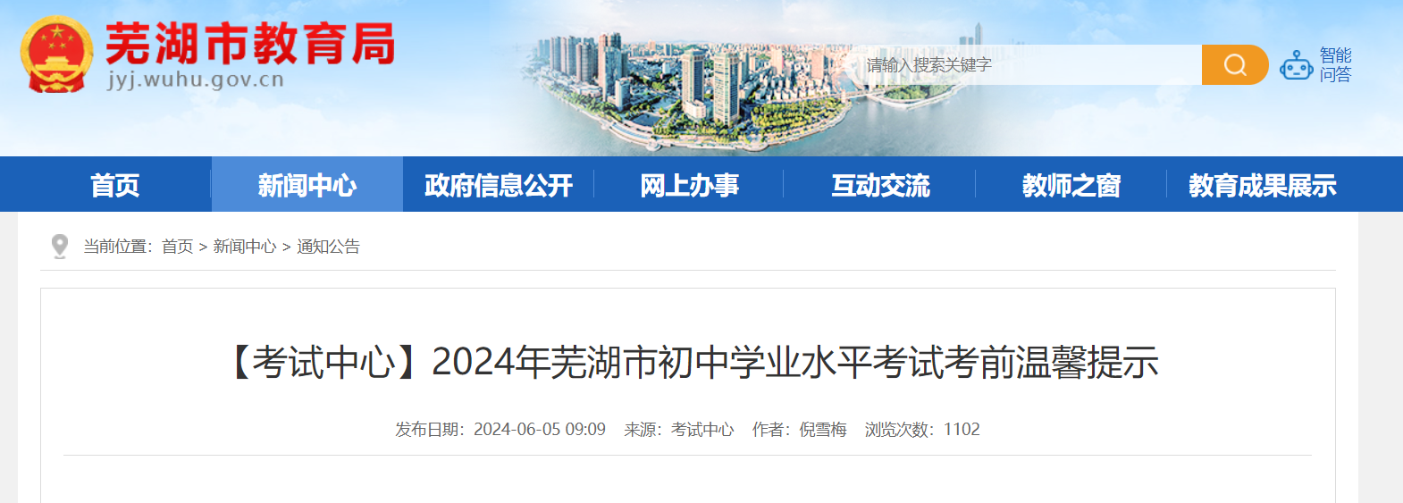 從蕪湖市教育局獲悉,2024年安徽蕪湖中考時間、考點安排及考前溫馨提示已公布,6月14日至6月17日舉行考試,具體詳情如下:
