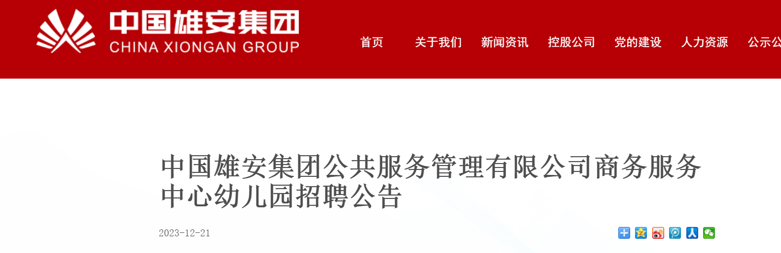 2023年河北中國(guó)雄安集團(tuán)公共服務(wù)管理有限公司商務(wù)服務(wù)中心幼兒園招聘教師15人,報(bào)名截止時(shí)間為2024年1月4日18:00,每人限填報(bào)1個(gè)崗位?,F(xiàn)將招聘公告原文發(fā)布如下: