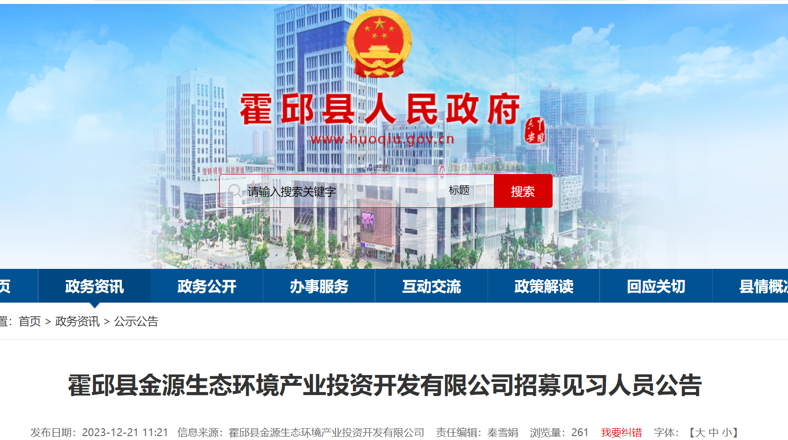 2023年安徽六安霍邱縣金源生態(tài)環(huán)境產(chǎn)業(yè)投資開發(fā)有限公司招募見習(xí)人員2名,采取郵箱報名的方式,報名時間招滿為止?,F(xiàn)將招聘公告原文發(fā)布如下: