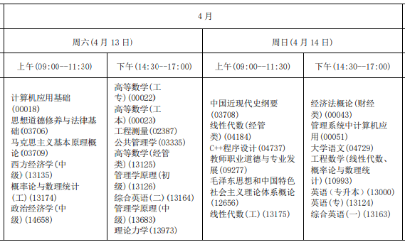 海南省??谑?024年上半年自學(xué)考試時(shí)間安排在2024年4月13日至14日,上午(09:00--11:30) ;下午(14:30--17:00)。