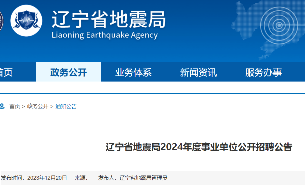 小編根據(jù)遼寧省地震局發(fā)布“遼寧省地震局2024年度事業(yè)單位公開招聘公告”得知,2024遼寧省地震局事業(yè)單位招聘10人,報名時間為2024年1月4日至1月18日。