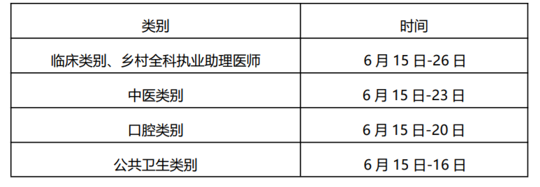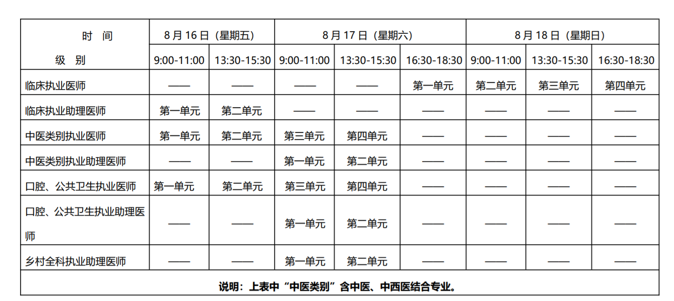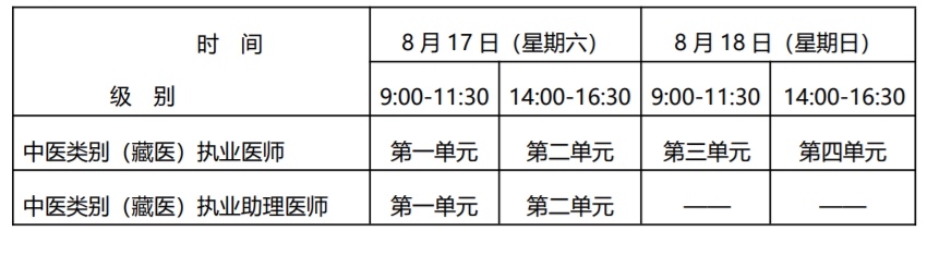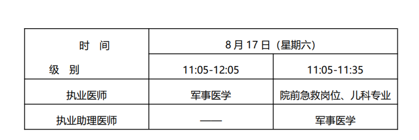 考試實行計算機化考試,軍隊現(xiàn)役人員加試軍事醫(yī)學(xué)、院前急救崗位和兒科專業(yè)加試相應(yīng)內(nèi)容。中醫(yī)類別藏醫(yī)專業(yè)實行紙筆考試。統(tǒng)一考試時間如下: