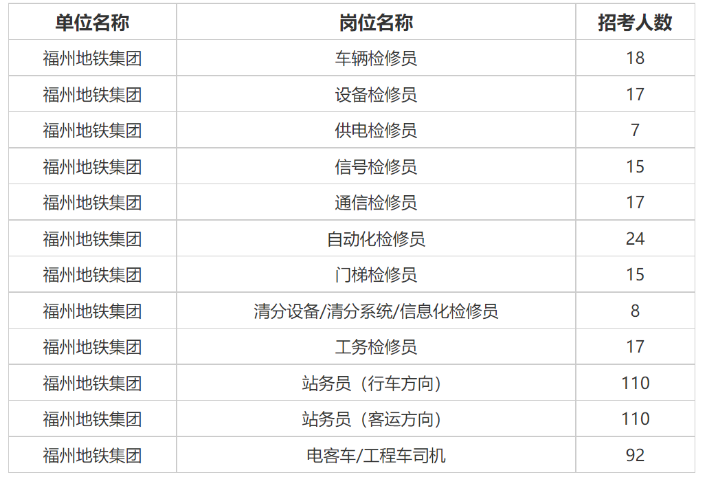福州地鐵集團有限公司是福州市從事城市軌道交通建設(shè)和運營的國有獨資公司,全面負(fù)責(zé)地鐵項目的投資、規(guī)劃、建設(shè)、運營、管理和沿線地下空間資源的開發(fā)利用。根據(jù)既有線路運營及新線籌備安排,福州地鐵面向(福建水利電力職業(yè)技術(shù)學(xué)院、福州職業(yè)技術(shù)學(xué)院、福建信息職業(yè)技術(shù)學(xué)院、福建船政交通職業(yè)學(xué)院、廈門城市職業(yè)學(xué)院、湖南高速鐵路職業(yè)技術(shù)學(xué)院、湖南鐵路科技職業(yè)技術(shù)學(xué)院、湖南鐵道職業(yè)技術(shù)學(xué)院、湖北鐵道運輸職業(yè)學(xué)院、山東職業(yè)學(xué)院、南京鐵道職業(yè)技術(shù)學(xué)院)11所大專院校開展2024屆應(yīng)屆畢業(yè)生專場招聘工作。一、需求計劃