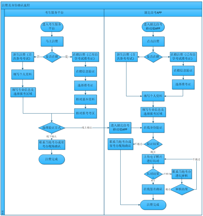 參加湖北省自學考試的考生請先在自學考試考生服務平臺或者湖北自考APP完成注冊。注冊完成后方可報考。注冊與身份確認流程圖如下: