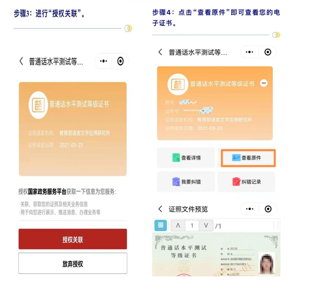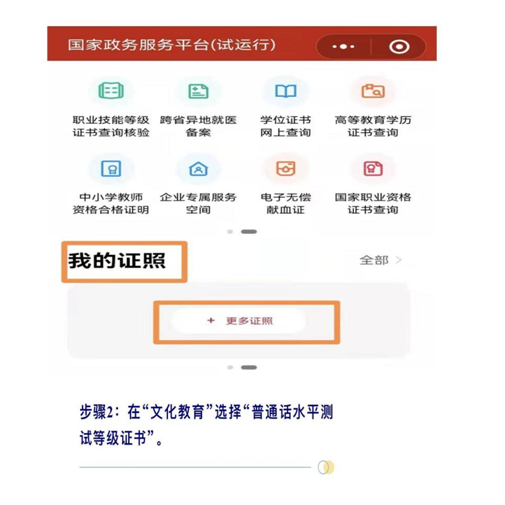 根據(jù)《普通話水平測試管理規(guī)定》(中華人民共和國教育部令【第51號】)第十五條,普通話水平測試等級證書分為紙質(zhì)證書和電子證書,二者具有同等效力。從2022年1月1日起,紙質(zhì)證書由國務(wù)院語言文字工作部門統(tǒng)一印制。目前,“國家政務(wù)服務(wù)平臺”已上線普通話水平測試等級證書。凡是在全國普通話培訓(xùn)測試信息資源網(wǎng)(http://www.cltt.org)能查詢到成績的考生均可通過“國家政務(wù)服務(wù)平臺”APP、微信小程序、支付寶小程序綁定電子證書。