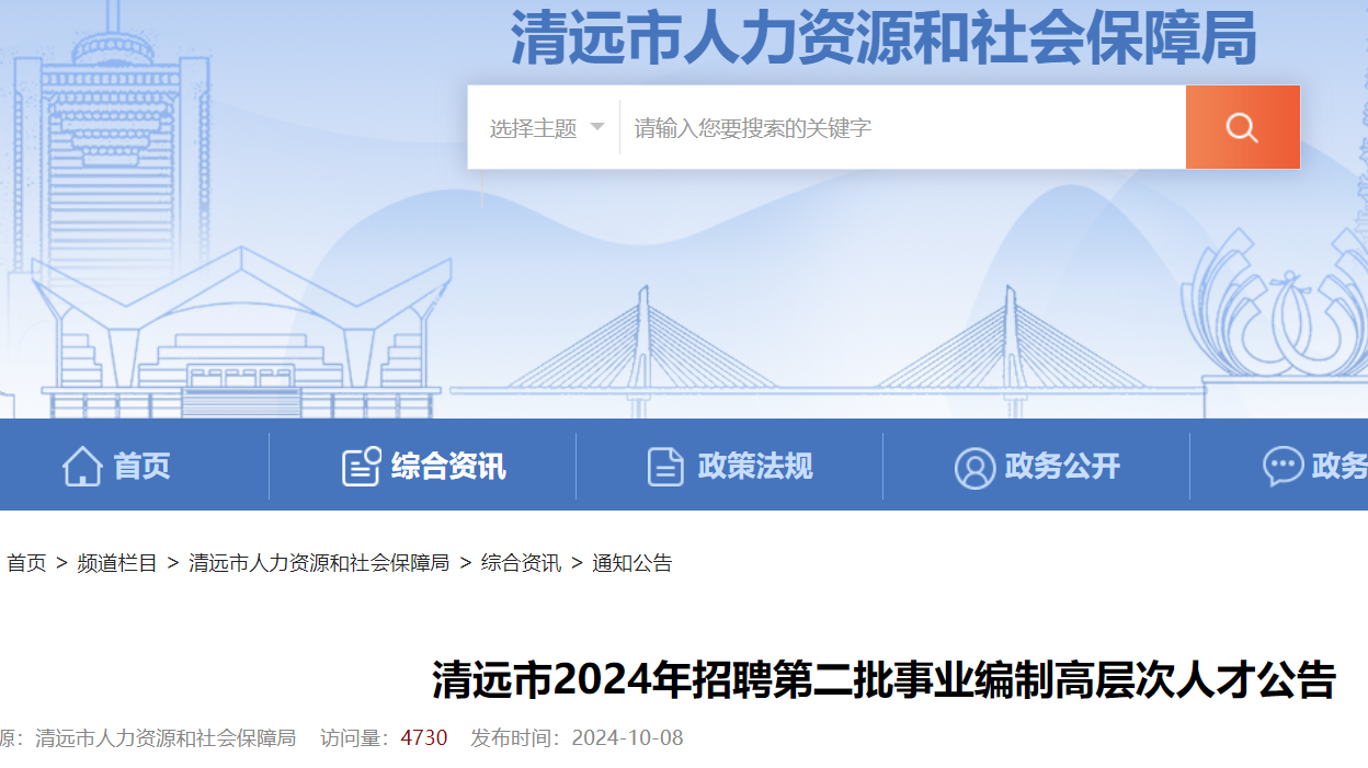 小編根據(jù)清遠市人民政府發(fā)布“清遠市2024年招聘第二批事業(yè)編制高層次人才公告”得知,2024廣東清遠市招聘第二批事業(yè)編制高層次人才6人,報名時間為2024年10月14日起至10月20日止。
