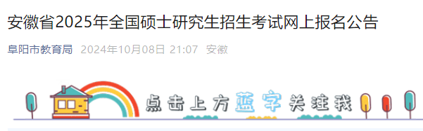 從阜陽市教育局了解到,安徽2025年全國碩士研究生招生考試網上報名公告已公布,網上報名時間:2024年10月15日至10月28日,每天9:00—22:00。具體如下: