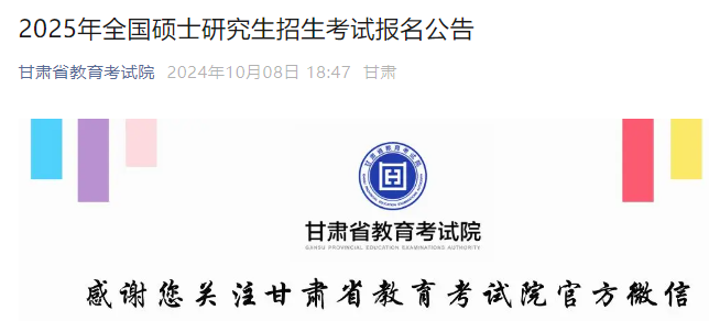 從甘肅省教育考試院了解到,2025年甘肅碩士研究生招生考試報名公告已公布,網(wǎng)上報名時間為2024年10月15日至10月28日(網(wǎng)上預報名時間為2024年10月9日至10月12日),每日9:00~22:00。具體如下: