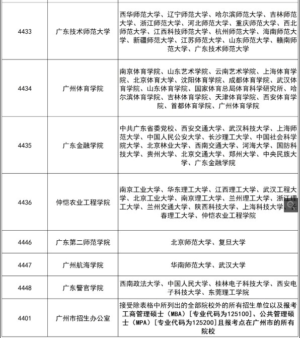 報考工商管理碩士(MBA)[專業(yè)代碼為125100]、公共管理碩士(MPA)[專業(yè)代碼為125200],且戶籍地或工作地為廣州市的考生應(yīng)在本報名點(diǎn)報名(不受上述表格列出招生單位的限制)。