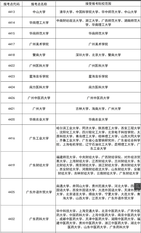 廣州市共設(shè)置23個報名點(diǎn),考生需按報考點(diǎn)接受范圍進(jìn)行報考(見下表)。