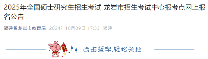 從龍巖市教育局了解到,2025年福建龍巖報考點碩士研究生招生考試網(wǎng)上報名公告已公布,具體如下: