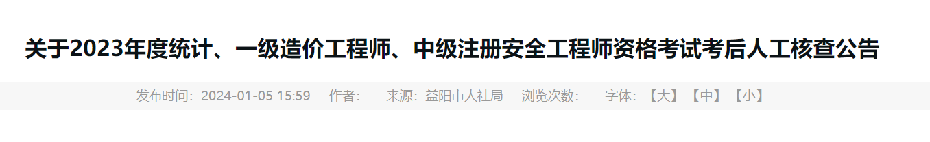 小編根據(jù)益陽市人力資源和社會(huì)保障局發(fā)布“關(guān)于2023年度統(tǒng)計(jì)、一級(jí)造價(jià)工程師、中級(jí)注冊(cè)安全工程師資格考試考后人工核查公告”得知,2023年益陽統(tǒng)計(jì)師考試成績(jī)合格人員考后人工審核時(shí)間為2024年1月9日—11日。