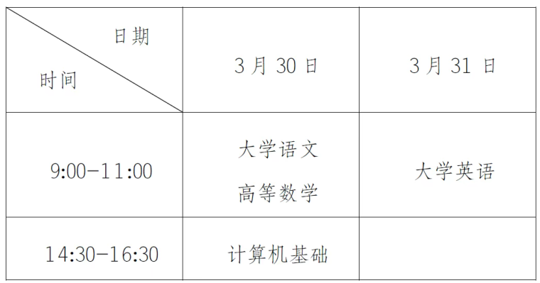 2024年3月30日:大學(xué)語文、高等數(shù)學(xué)(9:00-11:00)、計(jì)算機(jī)基礎(chǔ)(14:30-16:30)